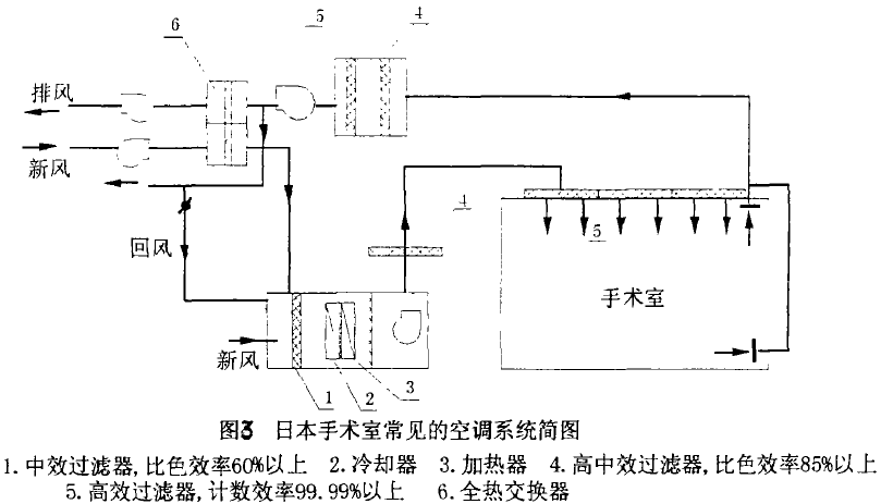 (1) 集中式全空氣係統。過去常采用中央空調係統, 根據各室的級別計算送風量, 各室不能單獨進行調節。這種方式在提供溫度、濕度、空氣淨化、去除臭味等方麵都可以達到滿意的效果; 由於(yu) 機房和房間分開, 噪聲可以較好地處理。所以適用於(yu) 恒溫、恒濕、無塵、無噪聲等要求的手術室場合。其缺點是風道占用空間大。有的也是全新風係統, 國內(nei) 常因為(wei) 全熱交換器投資較高、維護不易而不願采用, 係統能耗較大。